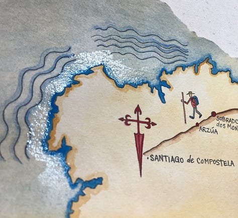 Combining Patrick’s stunning photography with my torn-map paintings, depicting the Way of Saint James, each month includes an positive declaration affirmation to guide and support you on your journey through life, whether you are on Camino across Northern Spain or at home contemplating your Sacred Mission and next adventure.